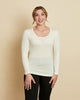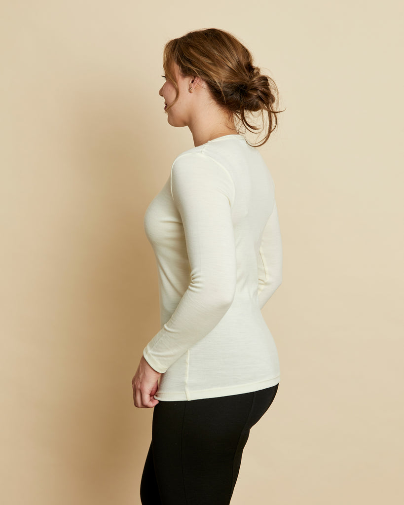 This classic scoop neck style top made in our lightweight Merino features fitted sleeves, binding around the neck, and subtle twin needled cuff and hem.
